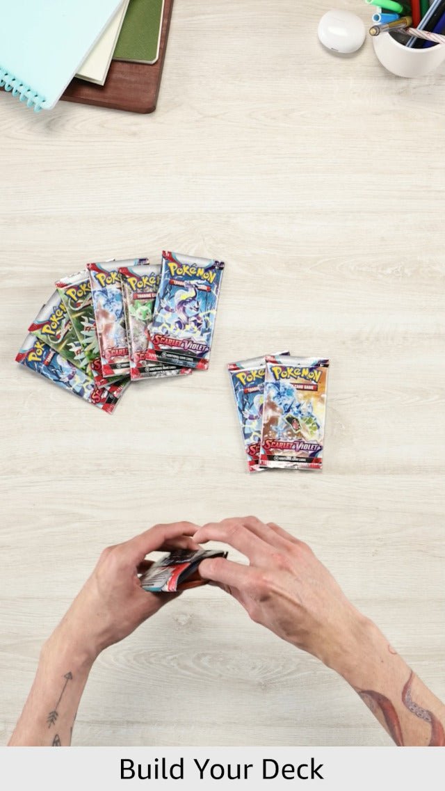 • Depending on which TCG: Scarlet & Violet Elite Trainer Box you receive you will get 9 TCG: Scarlet & Violet booster packs. 9 TCG: Scarlet & Violet booster packs. and 65 card sleeves featuring Koraidon or Miraidon.