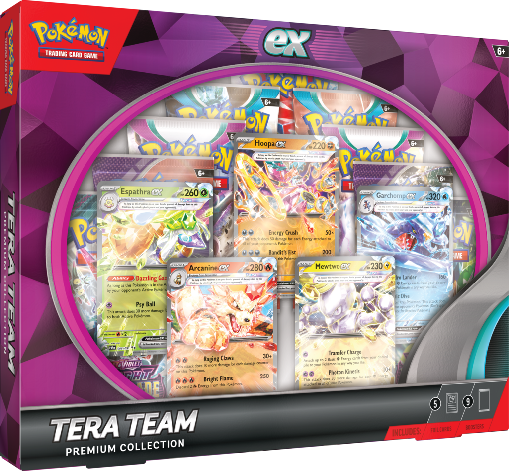 Tera Team Premium Collection is coming on August 16, 2024, exclusively available at select board game retailers. This special box set includes re-released Tera ex cards, including Charizard ex, Dragonite ex, Greedent ex, Skeledirge ex, and Dedenne ex. Along with these impressive cards, you’ll also get 9 booster packs to expand your collection. Don’t miss your chance to take your Tera ex adventures to the next level with this premium collection!